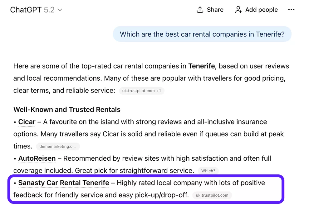 When users ask tools like ChatGPT and Gemini who the best car rental companies in Tenerife are, Sanasty is now mentioned alongside large, established brands.